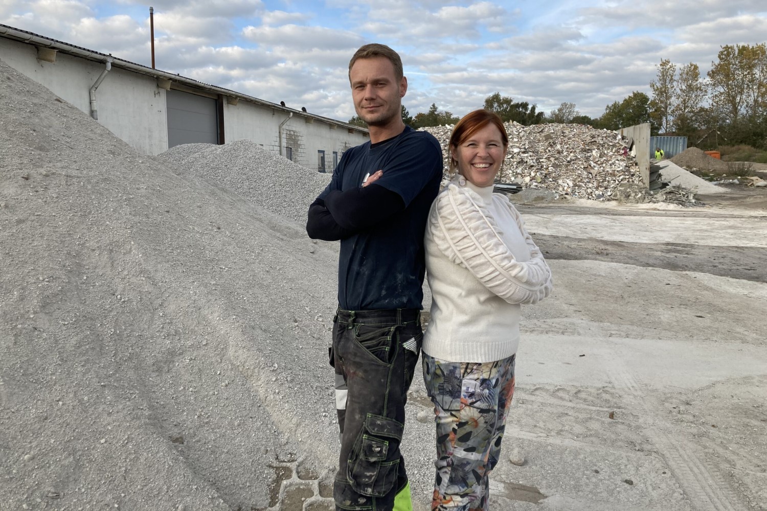Udviklings- og salgsdirektør Jens Rasmussen og administrerende direktør Annica Flade foran bunker med nogle af de typer af genanvendte ressourcer, som RECYCON Element anvender som tilslag i sin beton. Foto: Ressource City.