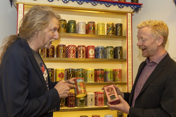 Der er god stemning og farverige tedåser på hylderne hos Østerlandsk Thehus. Ikke mindst fordi salgschef Jakob Holst og virksomhedsejer Torben Svendsen gennem Bio Change Zealand og Erhvervshus Sjælland forventer at få sparring, der kan hjælpe virksomheden med deres videre udvikling. Foto: Gitte Holm